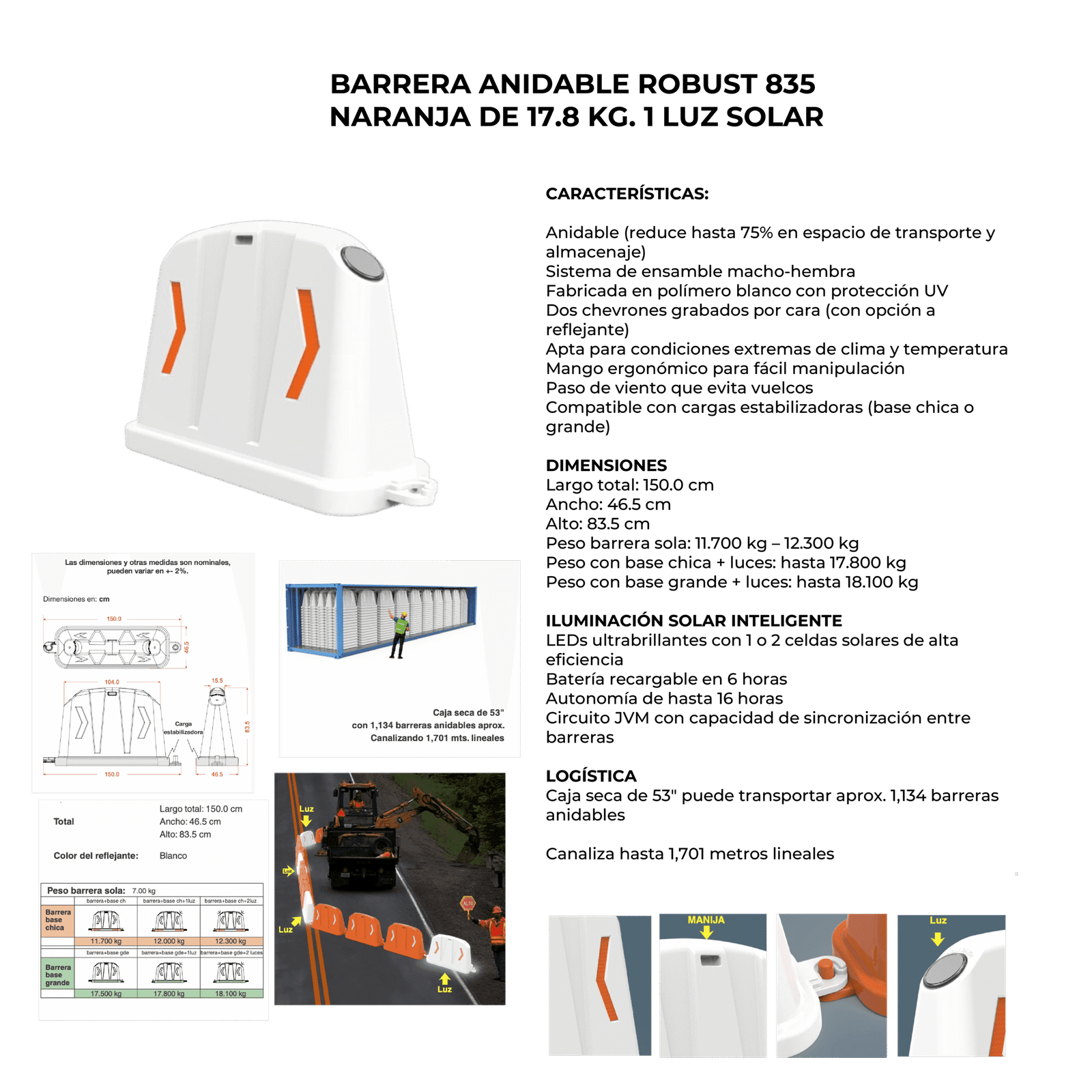 Descripción: Barrera vial anidable con sistema modular de fácil armado, única en su tipo en el mercado. Fabricada en polímero color: naranja. Con protección UV. Incluye dos chevrones por cara con opción a ser equipados con material reflejante blanco. Su sistema de ensamble macho-hembra permite el paso del viento evitando vuelcos. Puede incorporar una carga estabilizadora (chica o grande) para mejorar su desempeño. Ideal para guiar a peatones y vehículos hacia zonas seguras, esta barrera anidable representa una solución eficiente, práctica y económica para la gestión del tránsito y la seguridad vial. Medidas: Largo total: 150.0 cm. Ancho: 46.5 cm. Alto: 83.5 cm. Sin reflejante. Peso barrera sola: 7.00 kg. Peso con base grande: 17.800 kg. Pueden integrar sistema de iluminación solar con LEDs intermitentes. El panel solar realiza la carga completa en 5 horas de sol, proporcionando hasta 15 horas de iluminación intermitente. Sus LEDs de alta potencia, maximizan el rango de visibilidad, mientras que el sistema electrónico JVM permite la sincronización del parpadeo entre múltiples unidades, aumentando la seguridad en zonas de alto riesgo. 1 Luz solar.