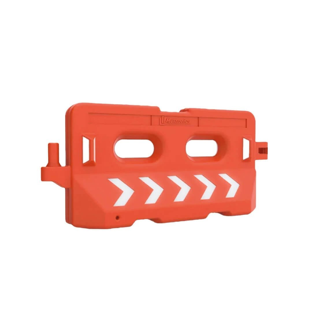 Barrera de protección vial, fabricada en polietileno altamente resistente. Color: Naranja. Medidas: Largo: 150 cm. Alto: 70 cm. para usar vacía o con lastre, ensamble fácil y rápido. Con flechas grado ingeniería prismático más salientes dos caras.